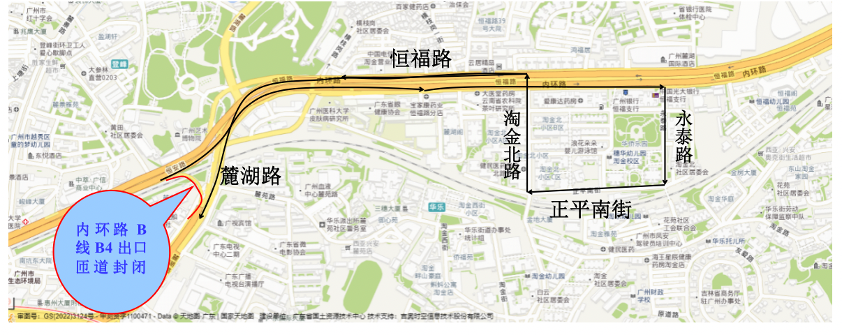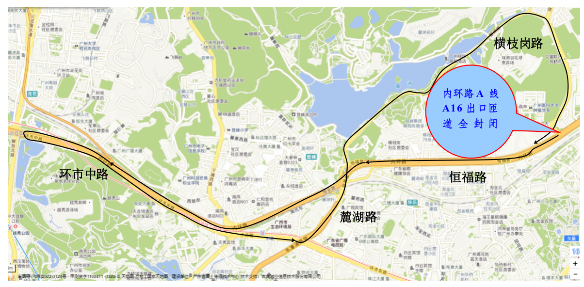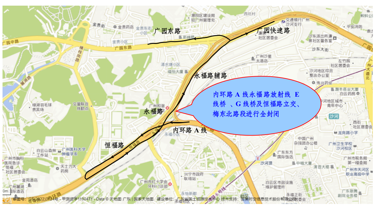 2022年11月7日至11月10日每日0时至6时对内环路A线永福路放射线E线桥、G线桥及恒福路立交、梅东北路段进行全封闭桥梁检测,封闭区域起点位于内环路A线A15出口匝道附近,终点位于匝道出口(与广园快速路和广园东路交接处)。