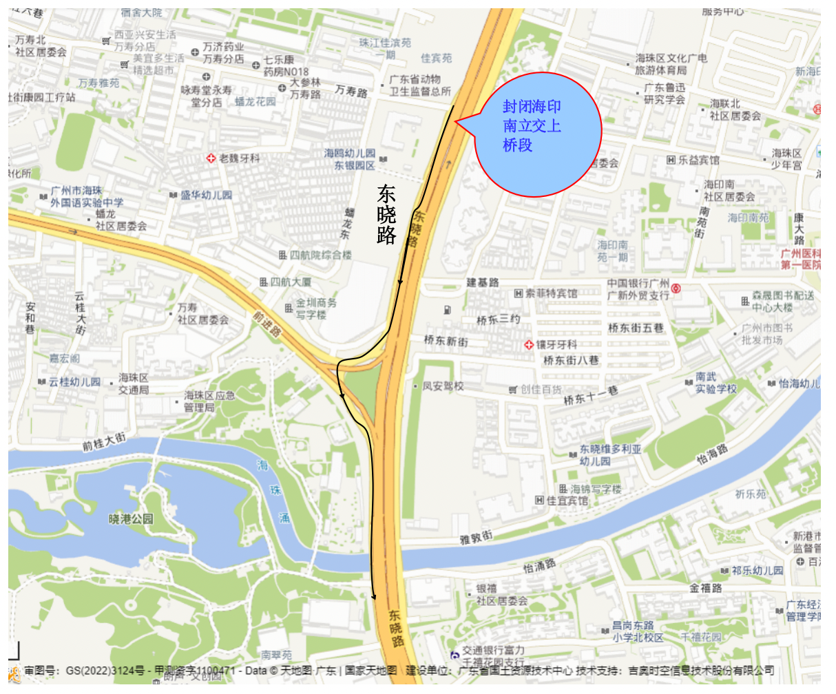封闭施工期间,东晓路由北向南通往海印南立交往东晓南路方向的车辆可继续沿东晓路行驶,具体绕行线路如下: