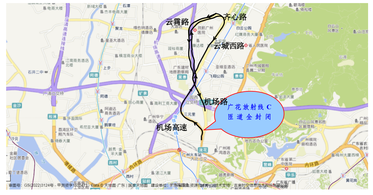 封闭施工期间,广花放射线(南往北)方向正常通行广,花放射线C匝道全封闭后车辆需绕道广花放射线主线,车辆具体绕行线路如下: