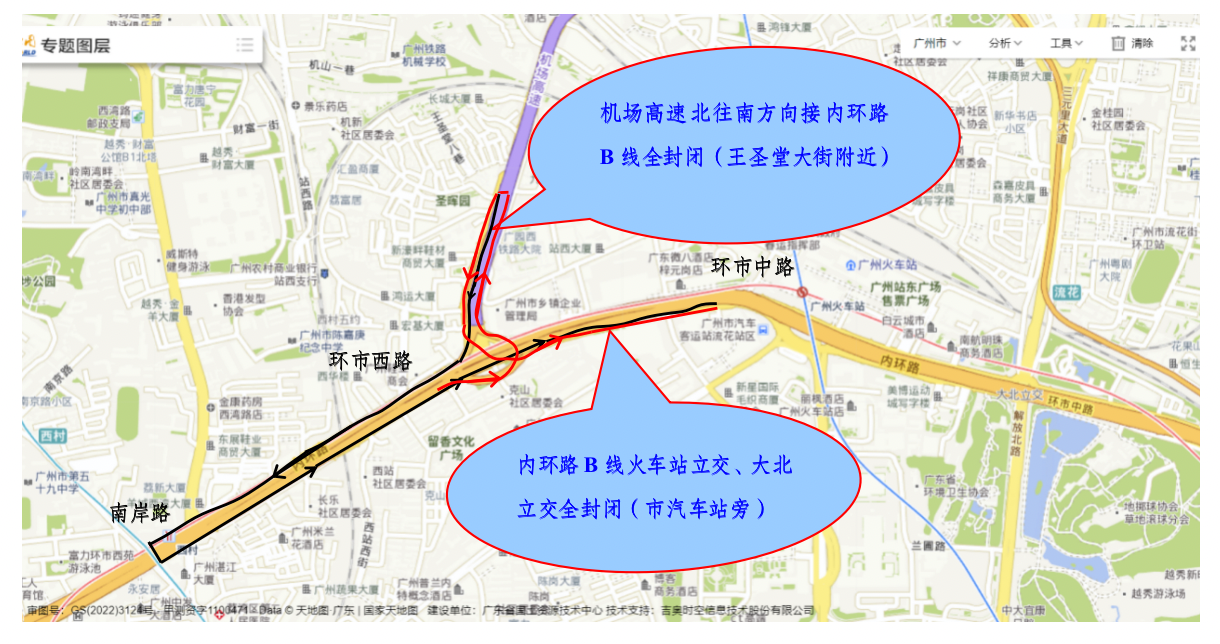 封闭区域二:起点位于王圣堂大街附近机场高速北往南方向(机场高速接内环路B线),终点位于市汽车总站附近的内环路B线。