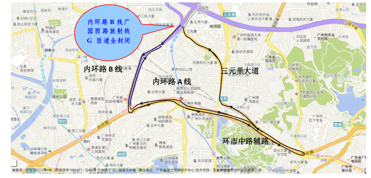 2022年10月24日至10月25日每日0时至6时对内环路B线广园西路放射线G匝道进行全封闭桥梁检测。广园西路放射线G匝道位于广州市白云区妇幼保健院对面,封闭区域起点位于机场高速三元里收费站出口匝道,终点位于匝道出口【广园西路辅路(北侧)】。