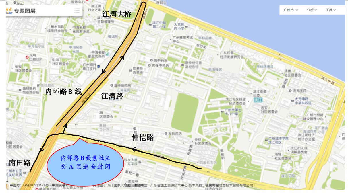 封闭施工期间,需经素社立交段(仲恺路)A匝道桥前往内环路B线方向的车辆可参考以下绕行路线: