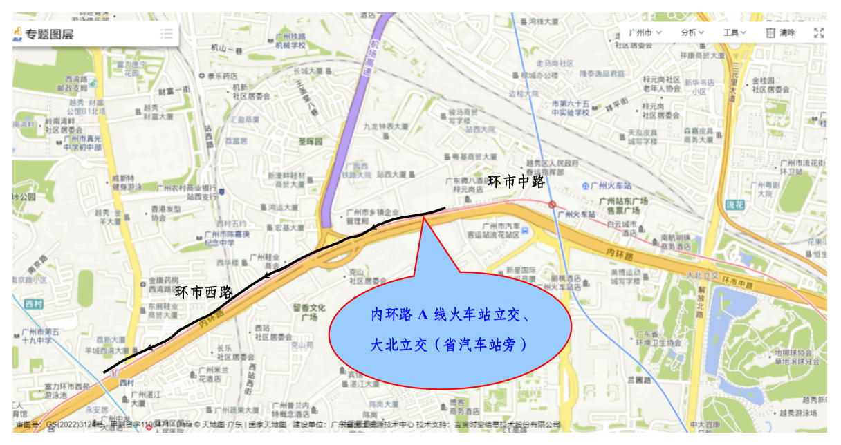 2.内环路B线往火车站方向:内环路B线匝道(广园西路、三元里大道等)出口驶出→在广园西路(南往北方向)红绿灯处调头→广园西路(北往南方向)与环市西路交叉路口→环市西路→火车站。
