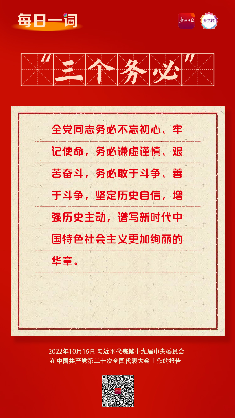 全党同志务必不忘初心、牢记使命,务必谦虚谨慎、艰苦奋斗,务必敢于斗争、善于斗争,坚定历史自信,增强历史主动,谱写新时代中国特色社会主义更加绚丽的华章。