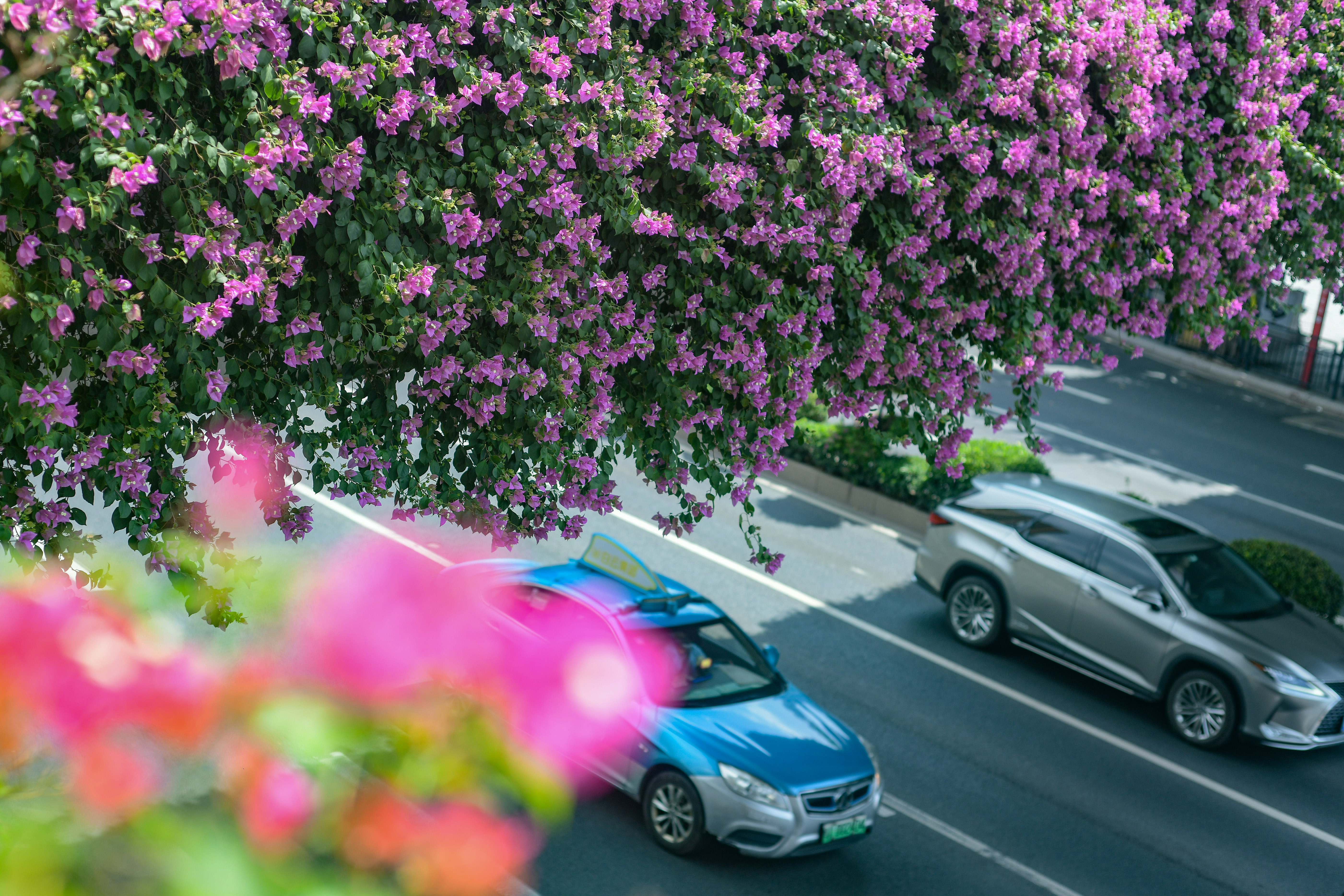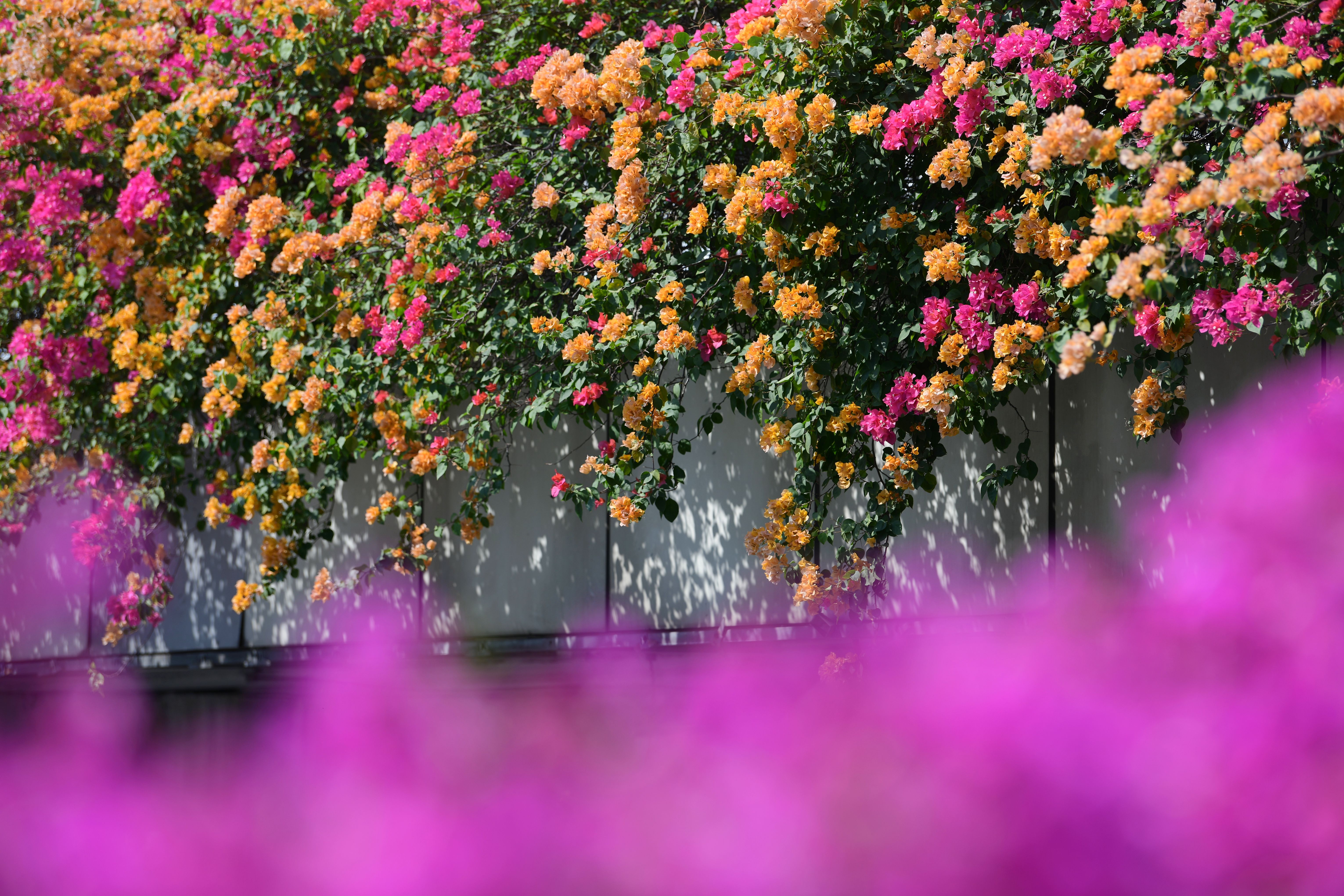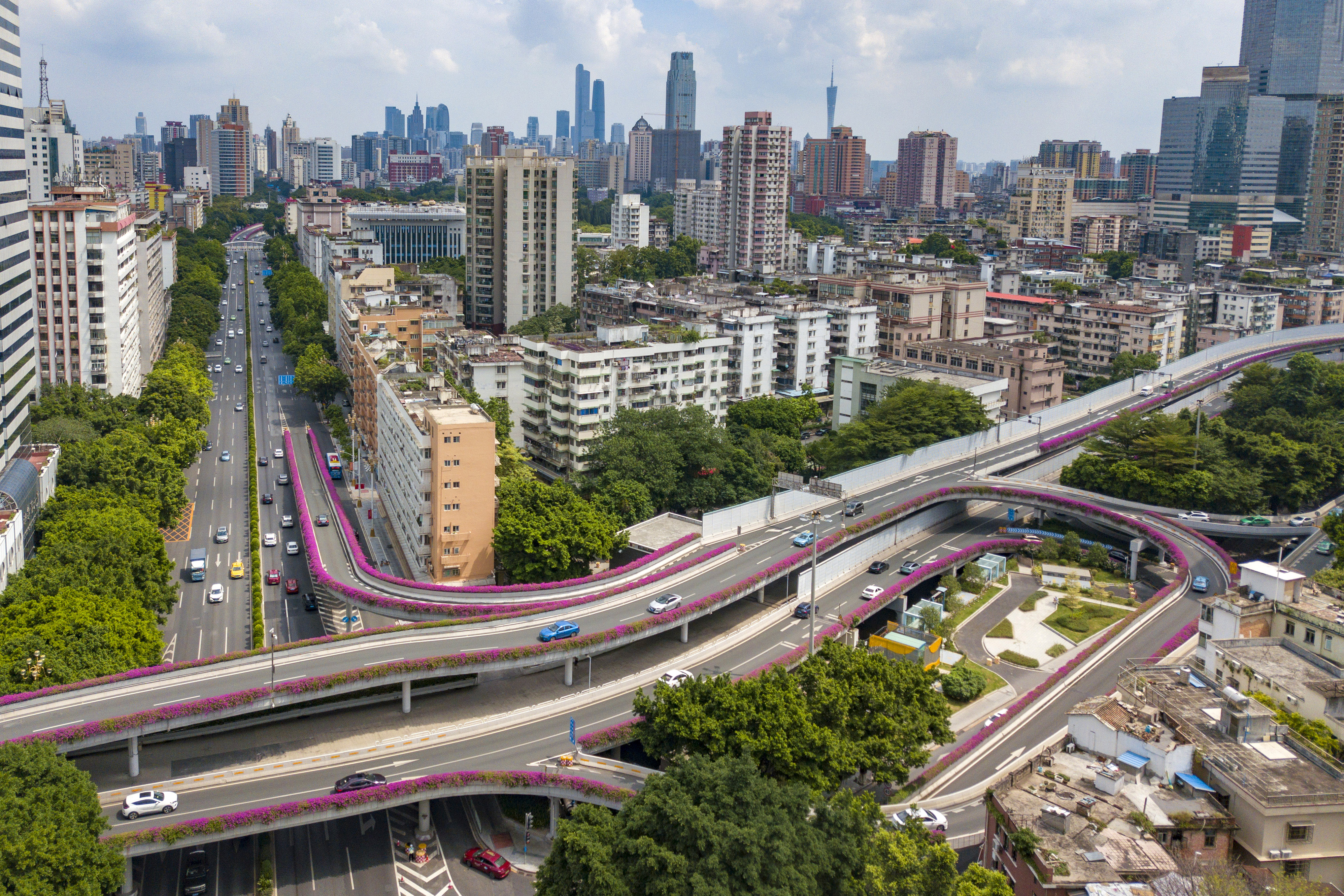 一座座绚丽多彩的空中花廊,像是为城市披上了一条条鲜艳的彩带,红的、紫的、黄的、粉的......竞相绽放、姹紫嫣红,展现着美丽宜居花城的新风采,焕发着千年花城的无穷魅力!