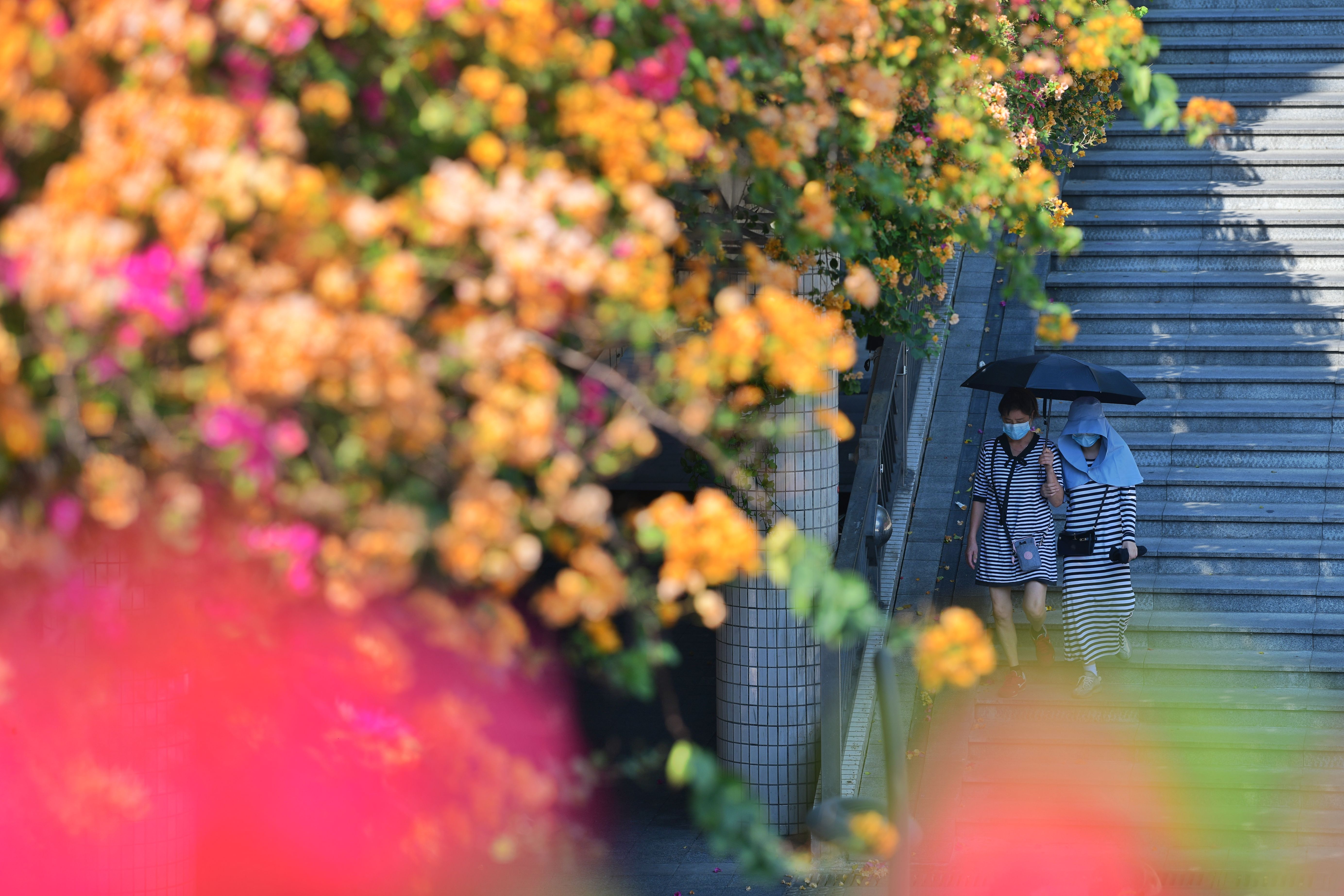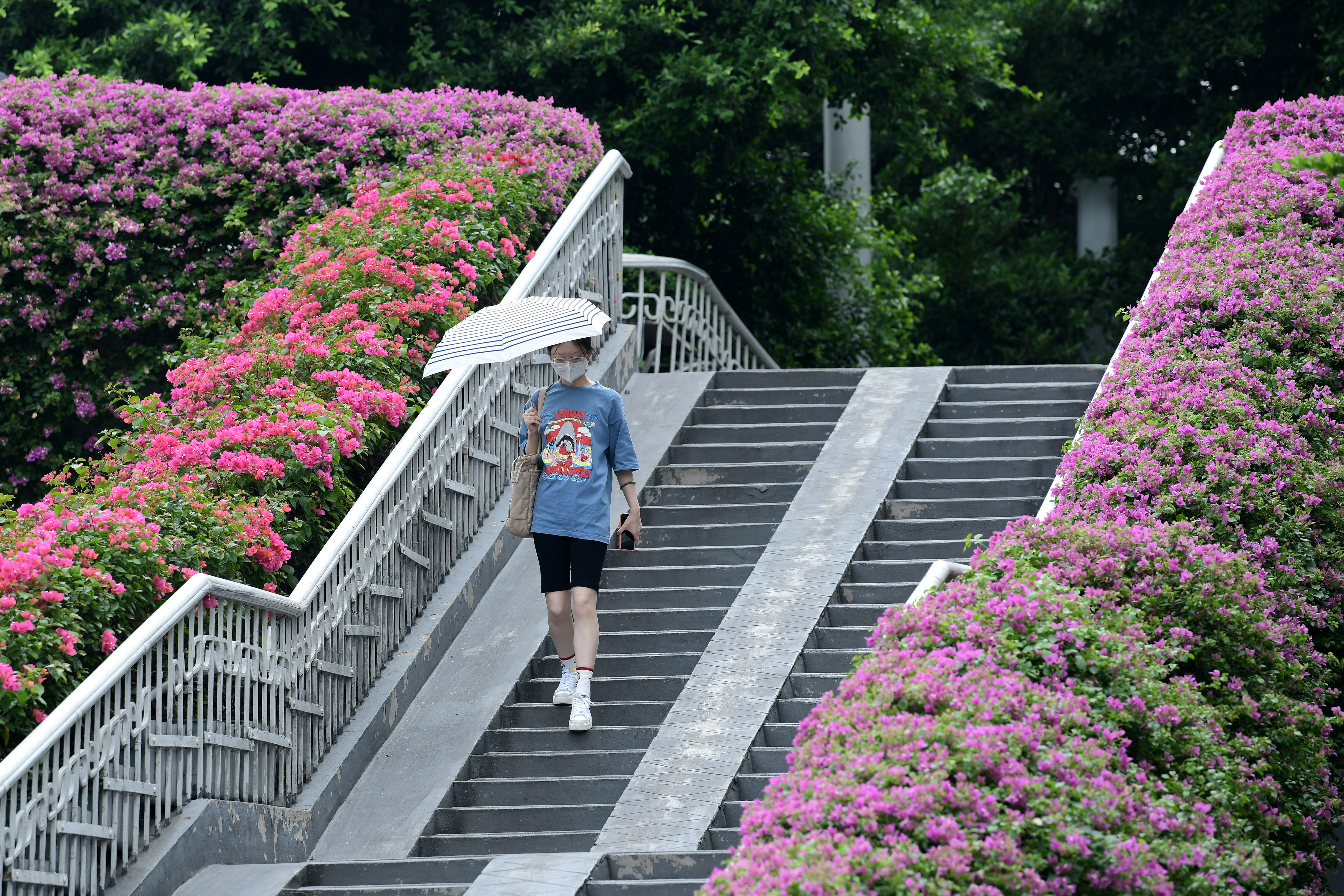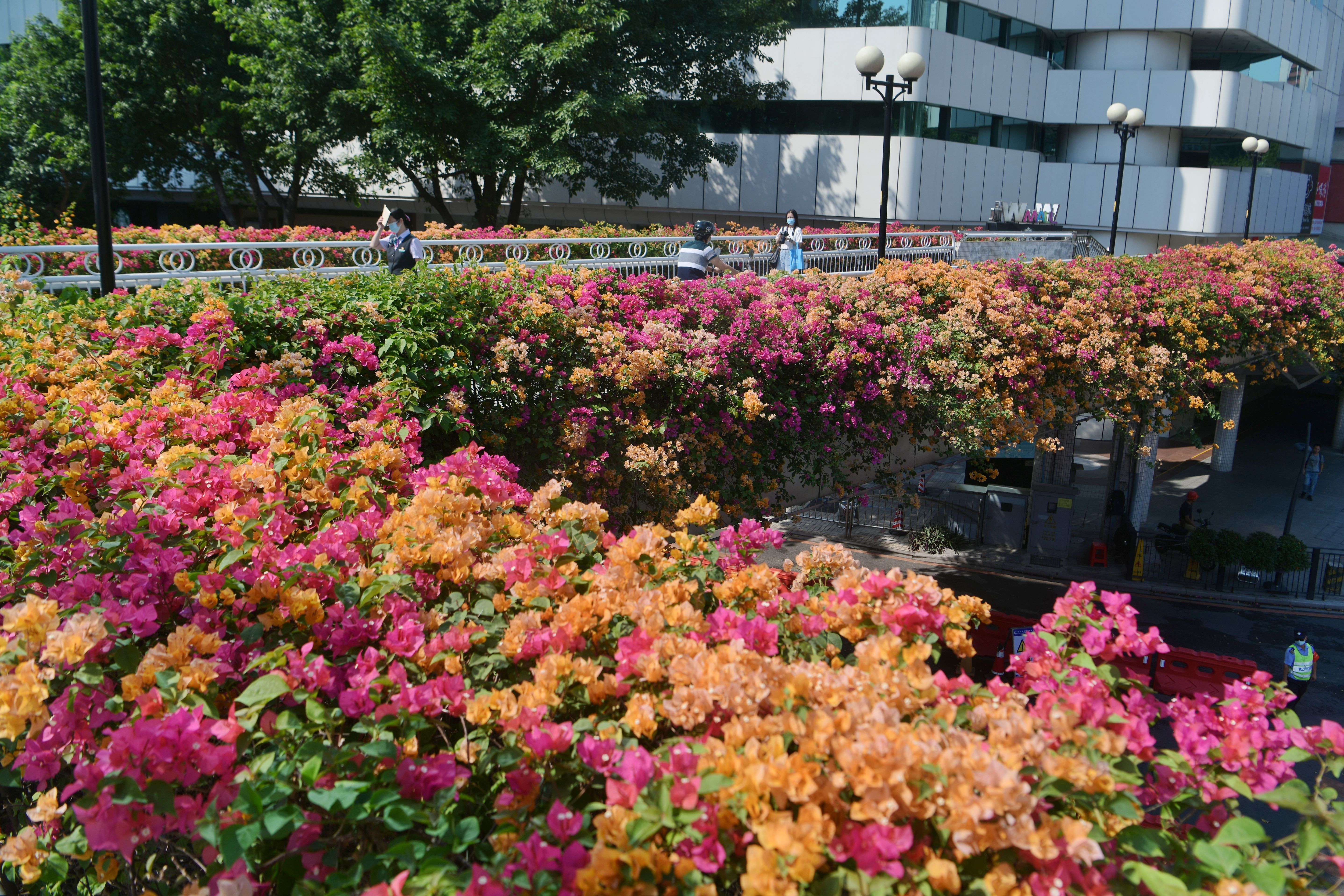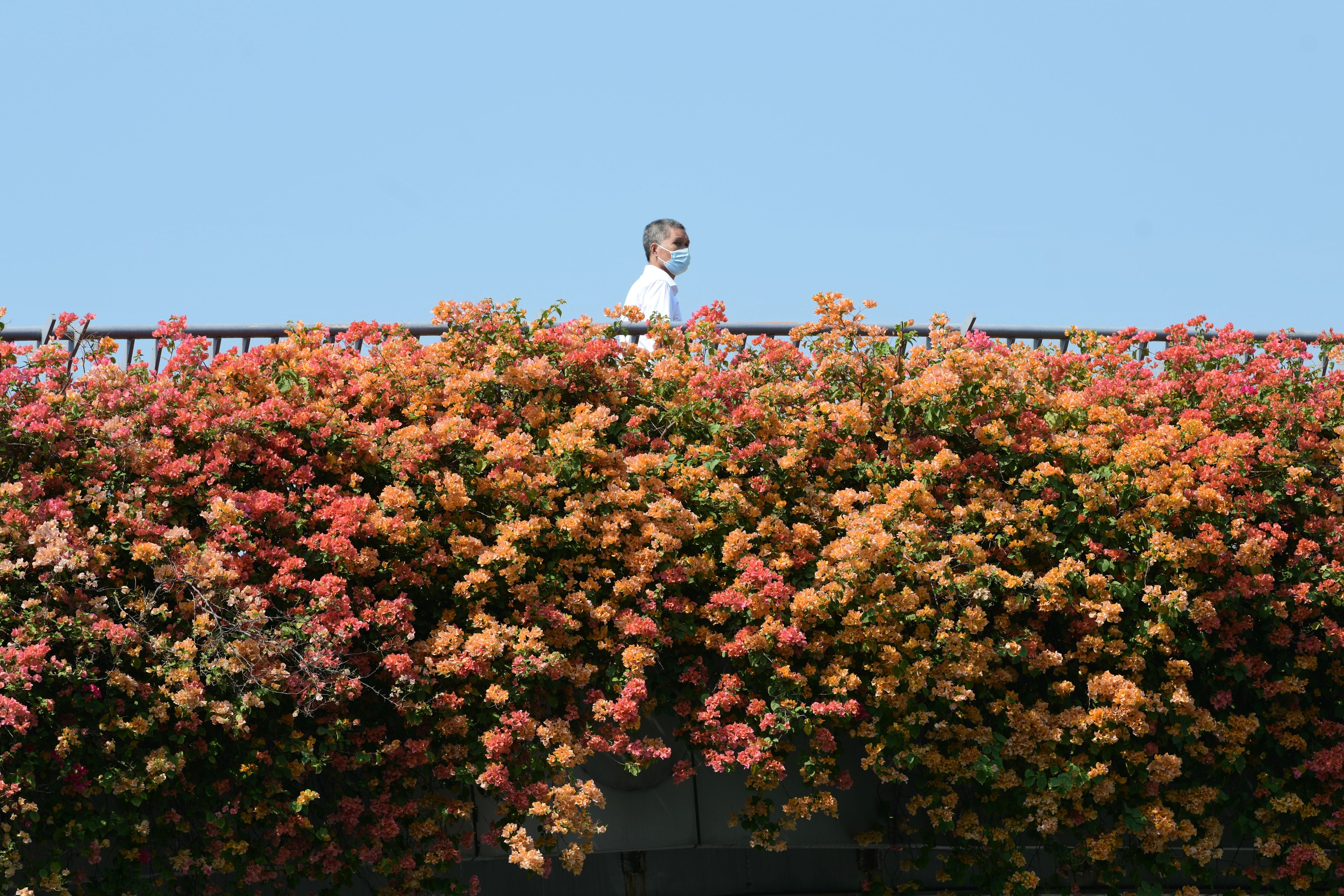 市民在开满簕杜鹃的赤岗北路天桥上行走。