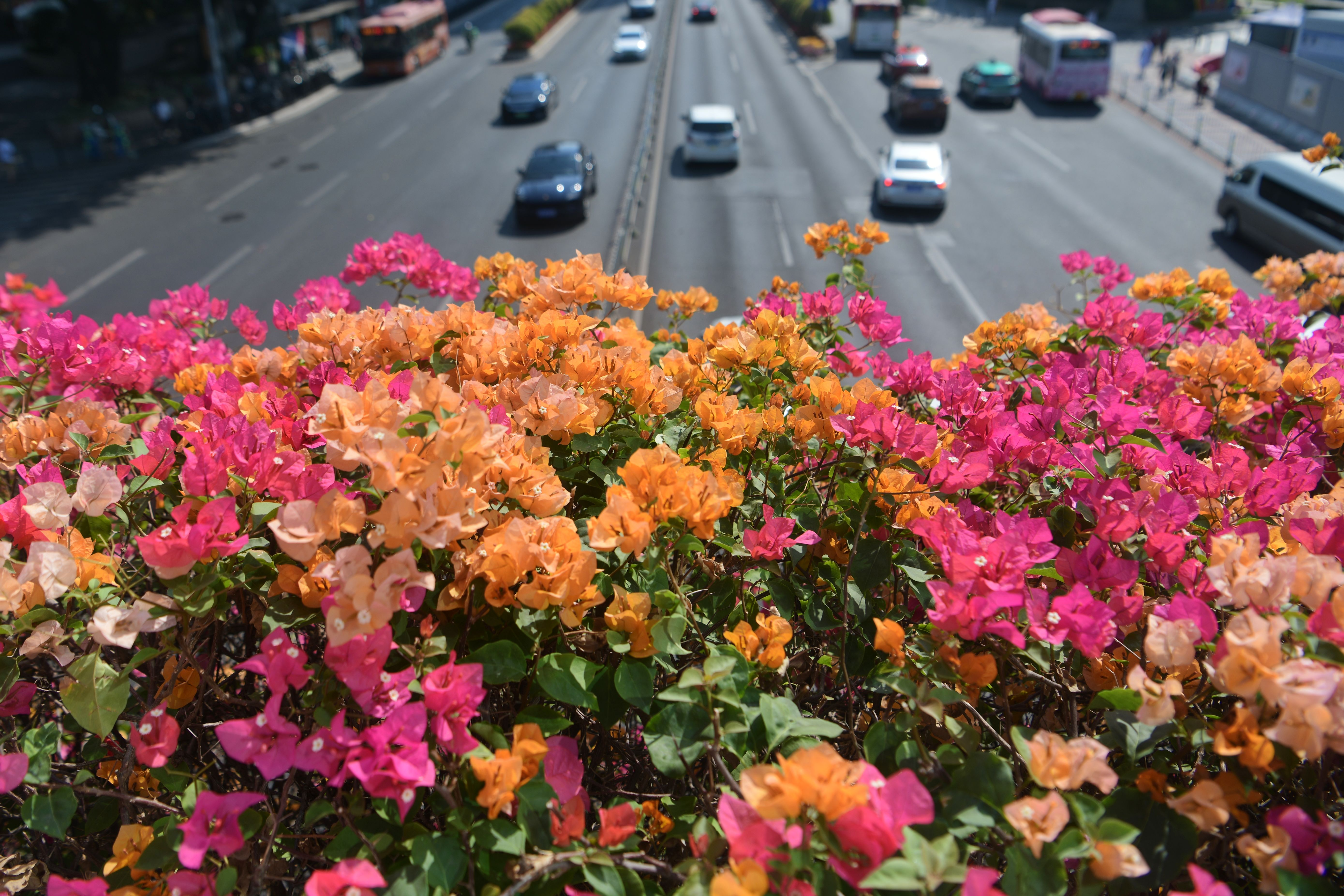 环市东路一座人行天桥上开满了各色的簕杜鹃。