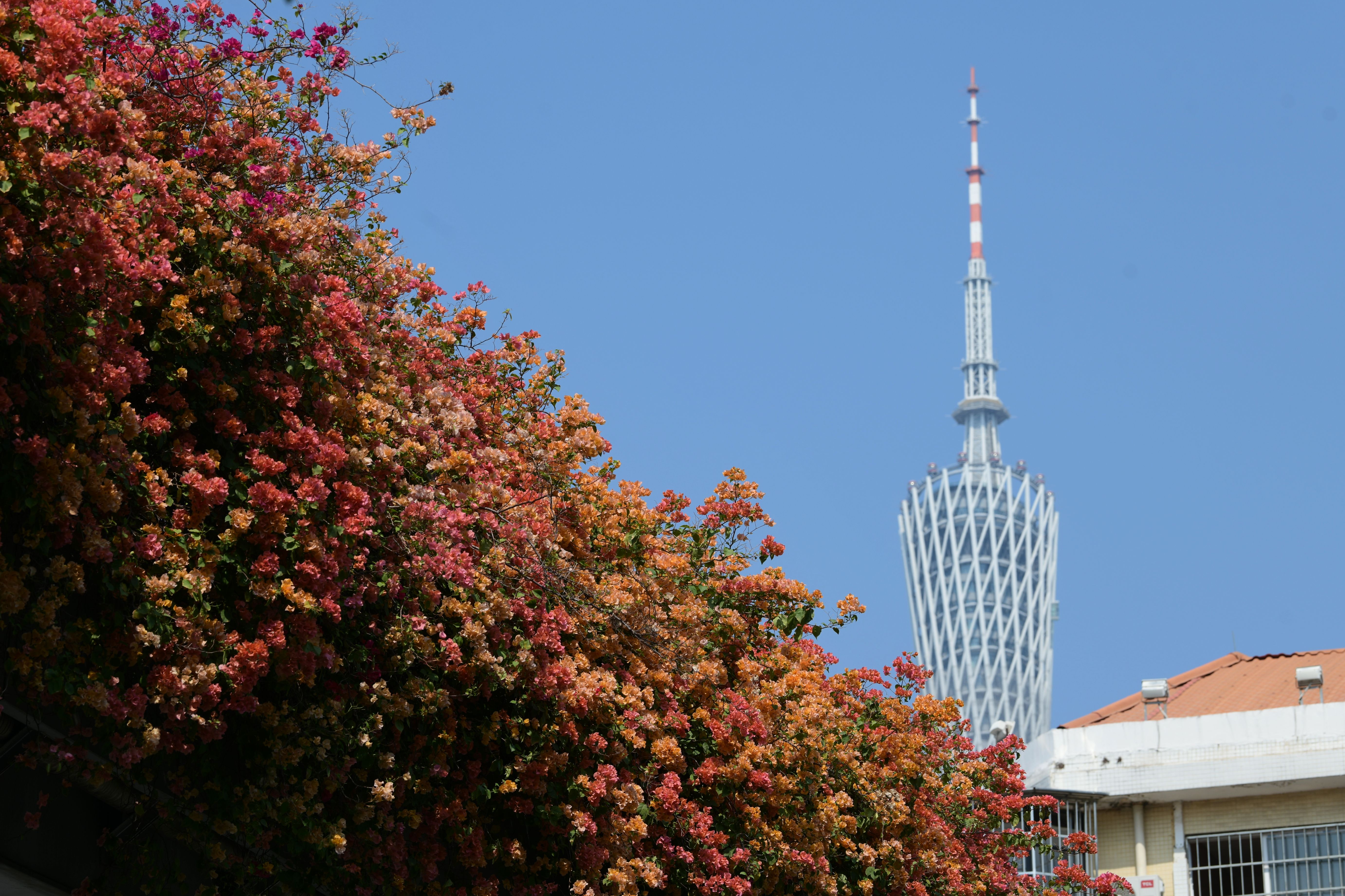 赤岗北路一座天桥上开满了橙色的簕杜鹃,美丽的簕杜鹃与广州遥相呼应。