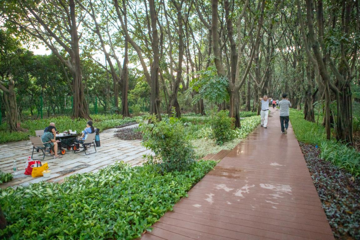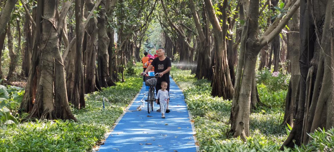 一方面,项目通过设计曲径通幽的园路,为附近居民和游玩的群众提供合理游憩路线。项目计划增设园路约320米,打造特色栈道约150米。其中,特色栈道建设穿梭于榕树林,为适应榕树生长特性,栈道平面高于树根落地面约30cm,达到保护榕树生长的目的。