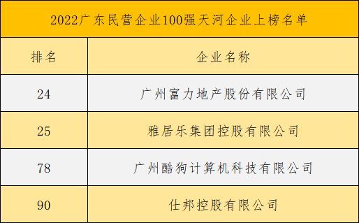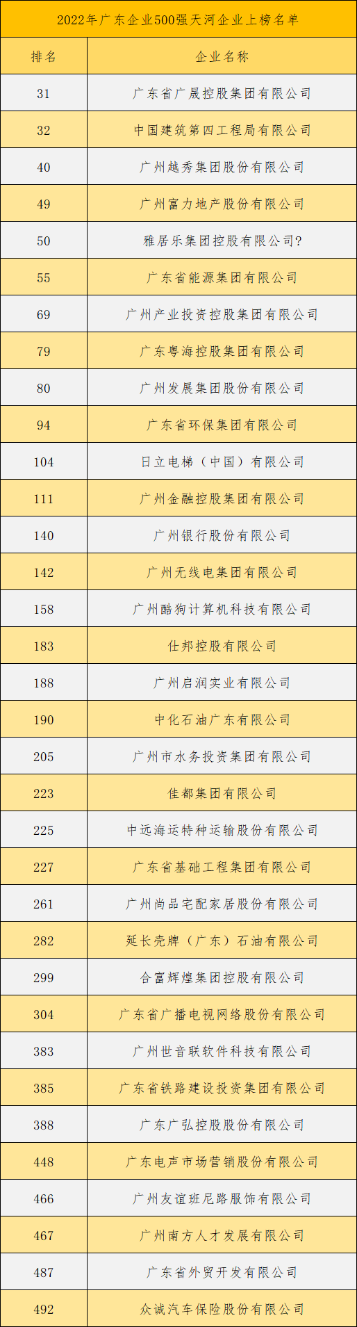 近日,广东省企业联合会、广东省企业家协会发布《2022广东500强企业发展报告》,并同步公布2022广东企业500强等四大榜单。据悉,该榜单以企业营业收入为排序依据,今年500强榜单的营收入围门槛首次突破23亿元,千亿级企业数量增加至34家,其中广州天河区34家企业入选该榜单。