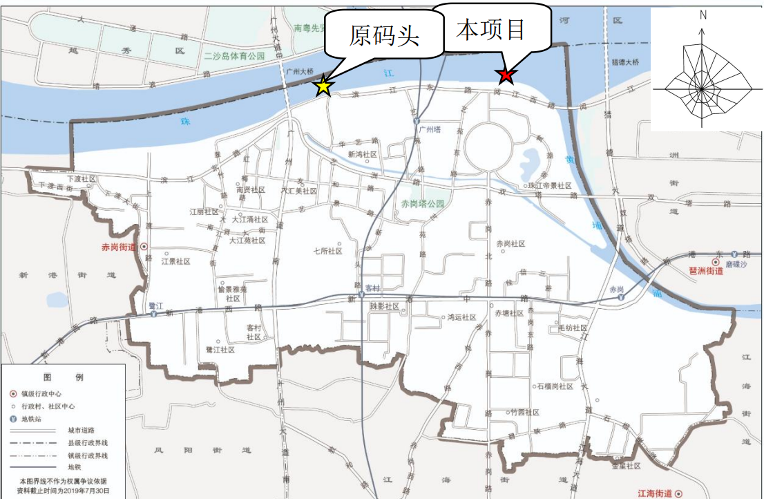 广州市水上巴士广州塔码头迁建工程位于广州市海珠区赤岗街广州塔下珠江堤岸、财富码头东侧,上游距广州大桥约1250米,下游距猎德大桥约500米。迁建前,广州塔码头位于广州塔下珠江堤岸、财富码头西侧,上游距广州大桥约230米,下游距猎德大桥约1500米。
