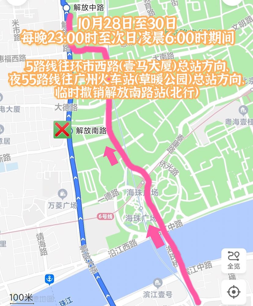 26日,记者了解到,因解放大桥检测需要,2022年10月28日至30日每晚23时至次日凌晨6时期间,一汽巴士三分公司5路线往环市西路(壹马大厦)总站方向、夜55路线往广州火车站(草暖公园)总站方向,需临时绕行海珠桥、广州起义路等路段,临时撤销解放南路站(北行)。同时记者获悉,其中,5路线于22时30分在海珠客运站总站发车的尾班车会受到影响。5路线往海珠客运站总站方向、夜55路线往小洲村口总站方向的运营路线不变,请市民留意。