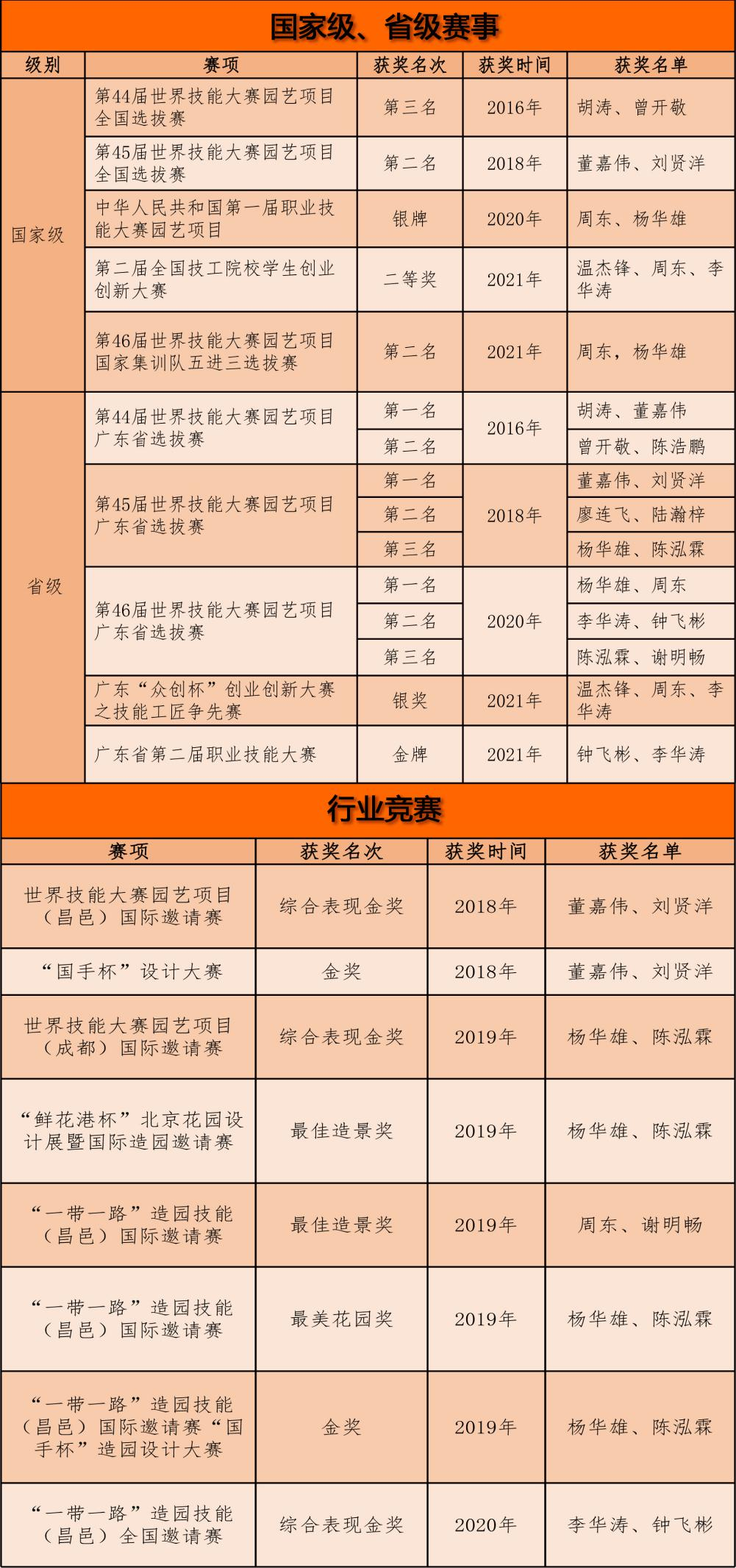 2016年,园艺项目成为我国出征第44届世界技能大赛的新增项目,广州市公用事业技师学院为此组建团队,开启园艺项目的人才培养与专业竞技。2016年-2022年之间,学院园艺项目团队在世赛各级选拔赛、国际邀请赛、全国职业技能大赛等赛事上获得多项荣誉。在六年的备赛、竞赛过程中,学院园艺项目团队奠定了良好的训练基础、积累了丰富的竞赛经验,也积极探索着大赛成果转化的多种路径。
