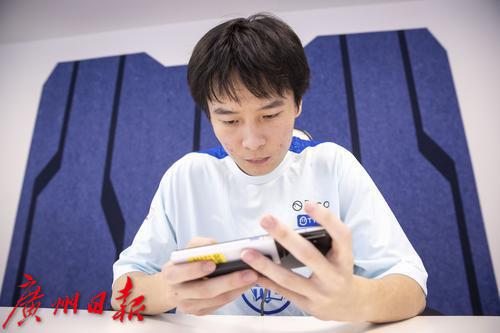 广州TTG电竞战队的主力辅助“冰尘”用手机训练王者荣耀。
