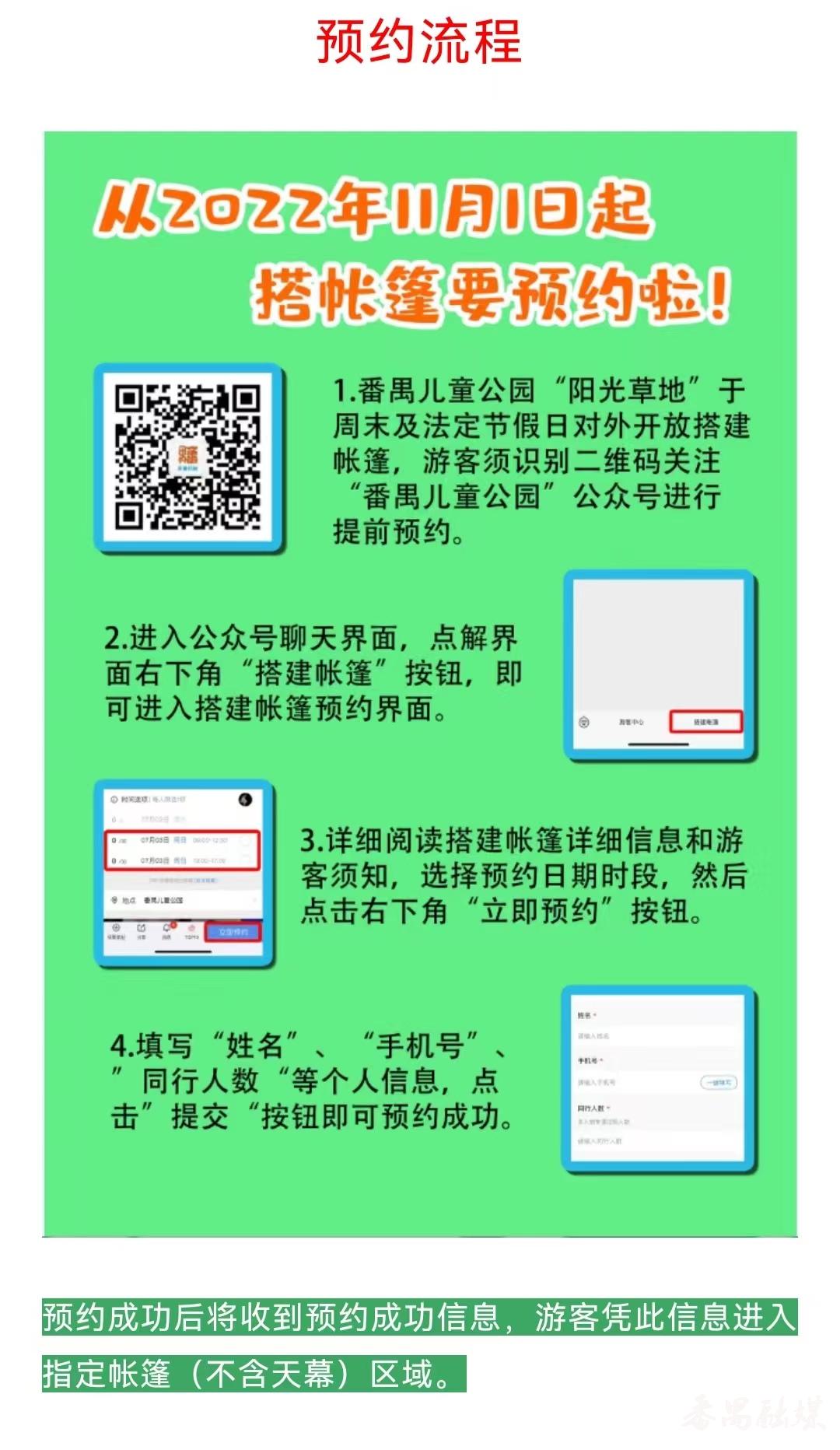 需要在番禺儿童公园搭帐篷的游客须识别二维码,关注“番禺儿童公园”公众号提前预约。进入公众号聊天界面,点击界面右下角“搭建帐篷”按钮,即可进入“搭建帐篷”预约界面;详细阅读搭建帐篷信息和游客须知,选择预约日期时段,然后点击右下角“立即预约”按钮;填写“姓名”“手机号”“同行人数”等资料,点击“提交”按钮即完成预约流程。预约成功后,将收到预约成功信息,游客凭此信息进入指定帐篷(不含天幕)区域。