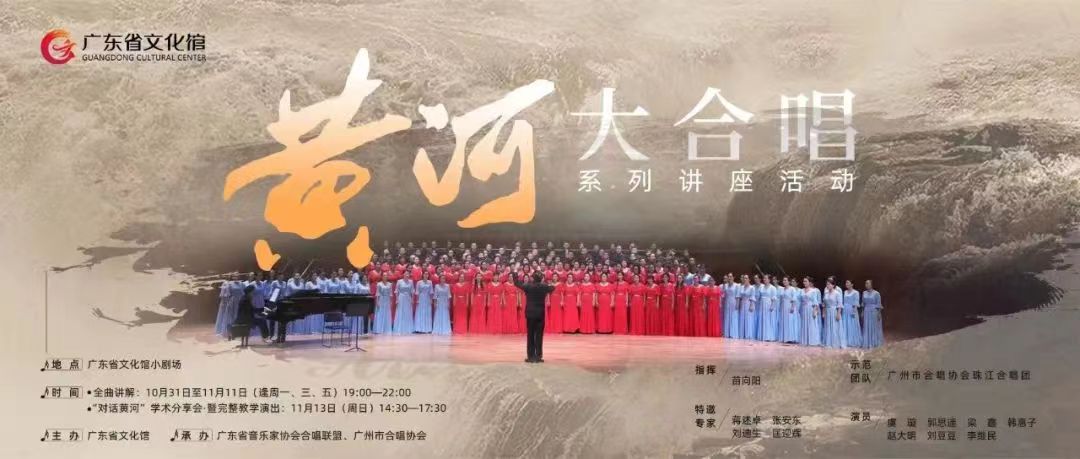 10月31日—11月13日,《黄河大合唱》系列讲座将在广东省文化馆小剧场举行。系列讲座邀请广州市合唱协会会长苗向阳、暨南大学中文系教授蒋述卓、《大河之魂:冼星海和他的非常岁月》作者刘迪生以及《黄河大合唱》词作者光未然之子张安东,通过现场排练教学和作品展示的方式,为大家深情讲述《黄河大合唱》的创作过程、艺术价值及革命故事。