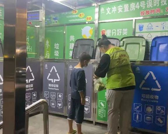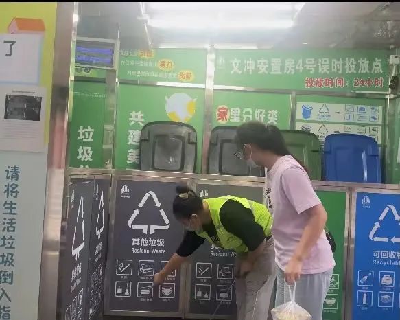 “能不能耽误你一分钟?我给你讲一下怎么分生活垃圾……”“快递盒子这些是可回收垃圾,要放到可回收物这个桶里……”“阿姨,剩菜剩饭这些是厨余垃圾······记住啊,要丢到指定的桶里”