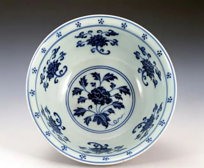景德镇窑青花缠枝莲纹碗。(明宣德,上海博物馆藏)