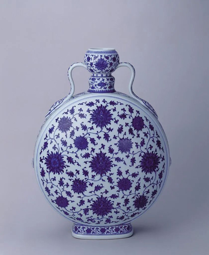 青花缠枝莲纹如意耳扁壶。(清乾隆,故宫博物院藏)