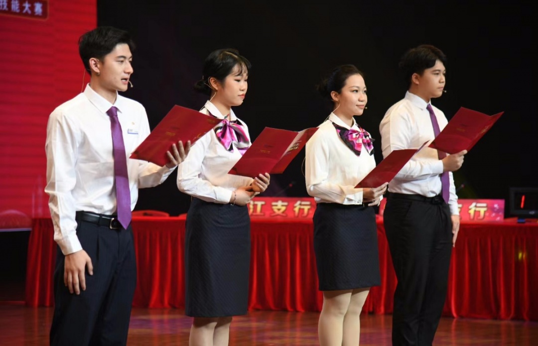 赛场上,各位参赛选手精神饱满,充分展示才能和自我风采,用丰富的知识储备和熟练的服务技能展开激烈角逐。整个比赛过程紧张有序,充分营造了“以赛促学、比学赶超”的浓厚学习氛围。比赛现场还穿插了番禺建行员工礼仪操和员工原创诗歌朗诵才艺表演,展示了员工丰富多彩的才艺和积极向上的精神风貌。