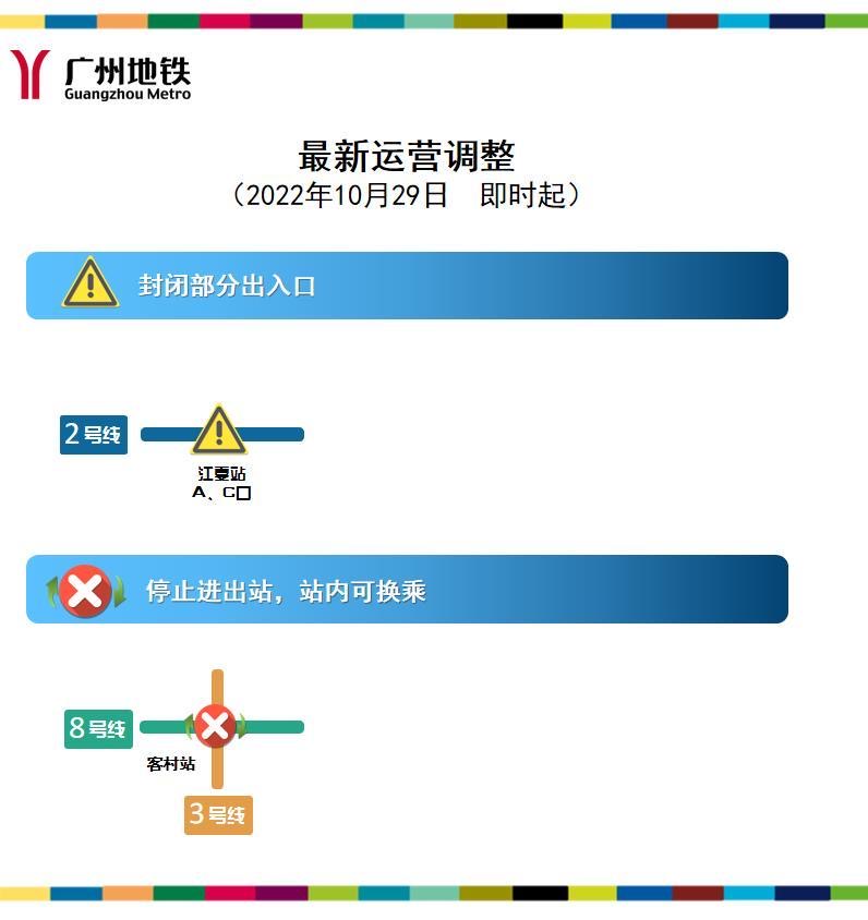 截至目前,三号线及八号线客村站停止对外服务,保留站内换乘功能;二号线江夏站A、C口封闭。