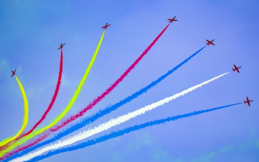 三是机群编队力求飞出壮观。表演特点是“整体性、震撼性”,通过八机编队、标枪队、菱形队、猎鹰队、钻石队跟头、七机开花和丘比特之箭等多个机群编队飞行表演动作,展现多机编队队形的威武壮观气势。