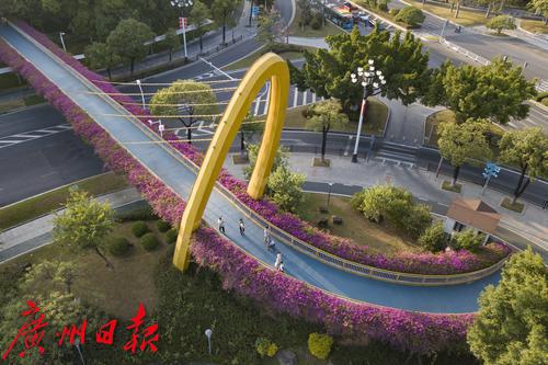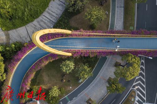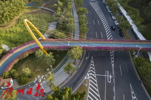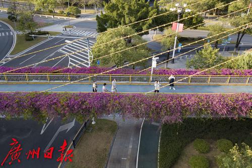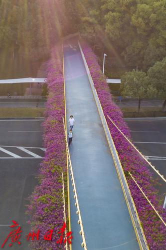 揽月桥设在黄埔区揽月路上,连接着科学大道到玉树公园之间,揽月桥设计灵感来源于扬帆起航,黄色拱形主塔十分亮眼。时下桥上两侧的簕杜鹃均已盛放,紫红色的花将天桥打造成了云端的花海,仿佛一条弧形秀场,不少游客经过纷纷驻足拍照。