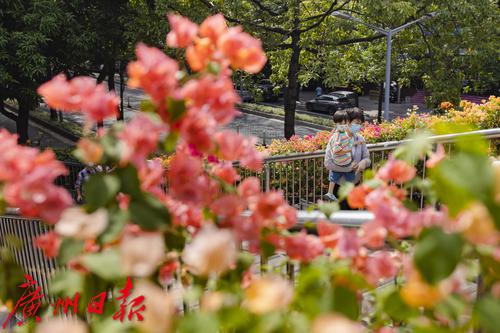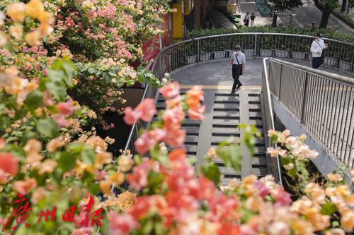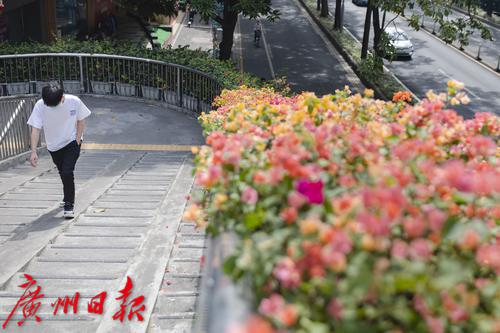 江南大道的一处人行天桥上,姹紫嫣红的勒杜鹃点缀街景。