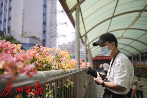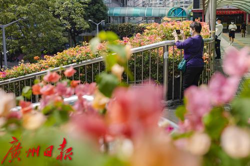 2022年10月31日,江南大道一处天桥上开满三色勒杜鹃,不少市民驻足欣赏美景。