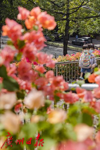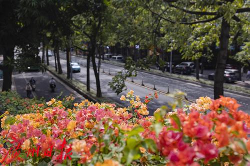 据广州天气微博,台风尼格31日起将带给广州风雨影响 ,随着“尼格”的靠近,广州出现了5-6级阵风。图为2022年10月31日白天,广州在阳光的照射下,紫外线比较强烈,街头的三色勒杜鹃迎风怒放。