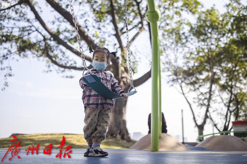 琶洲阅江中路一处口袋公园,孩子身着秋装。