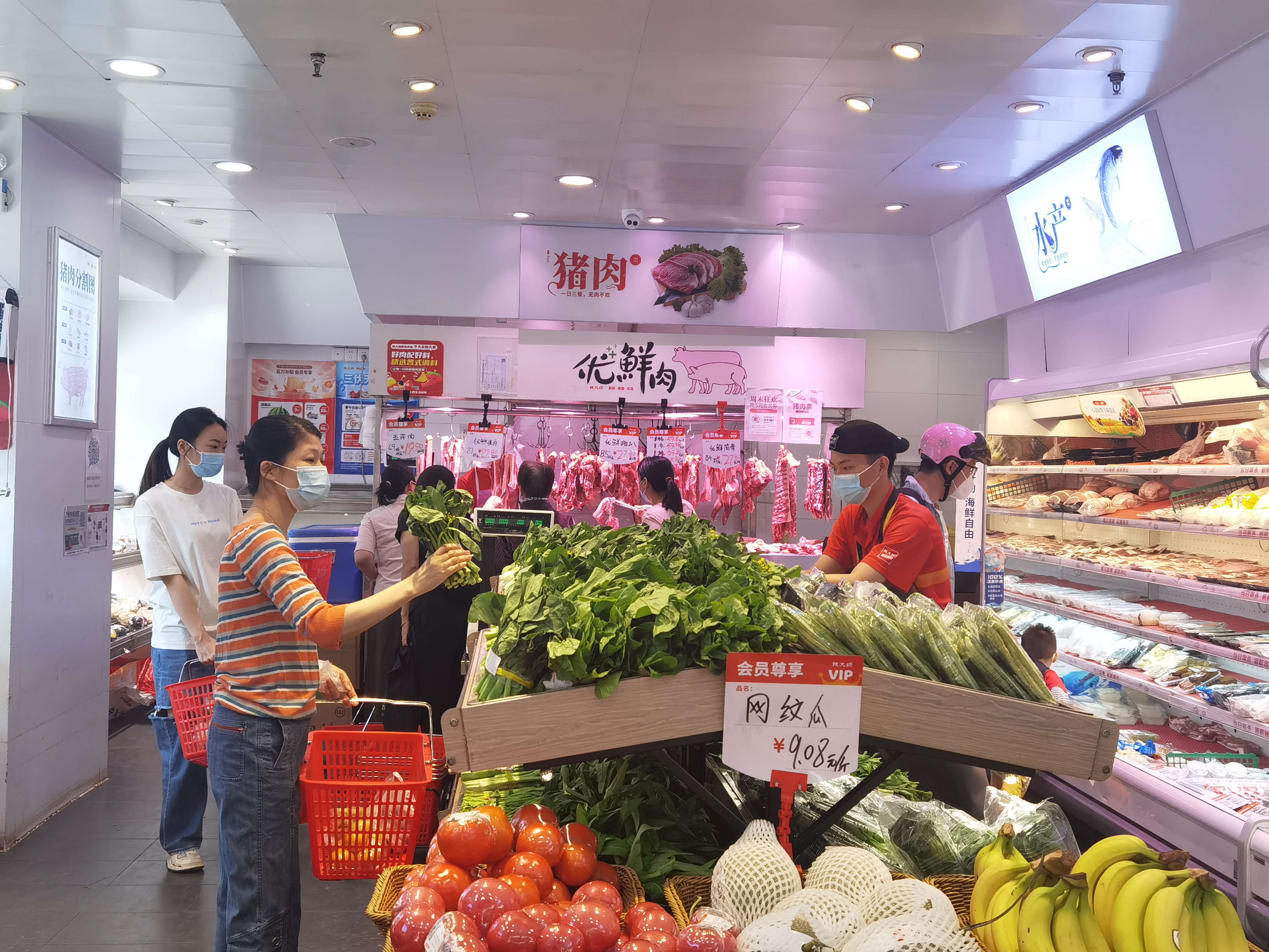 记者在棠景街棠安路钱大妈门店看到,工作人员早早就将菜品、肉品、水果等分类地摆上货架,整齐又充足。不少居民一早就进店选购,“钱大妈出品,我们都很放心,每天都有特价菜品,很新鲜。”社区居民周小姐说。