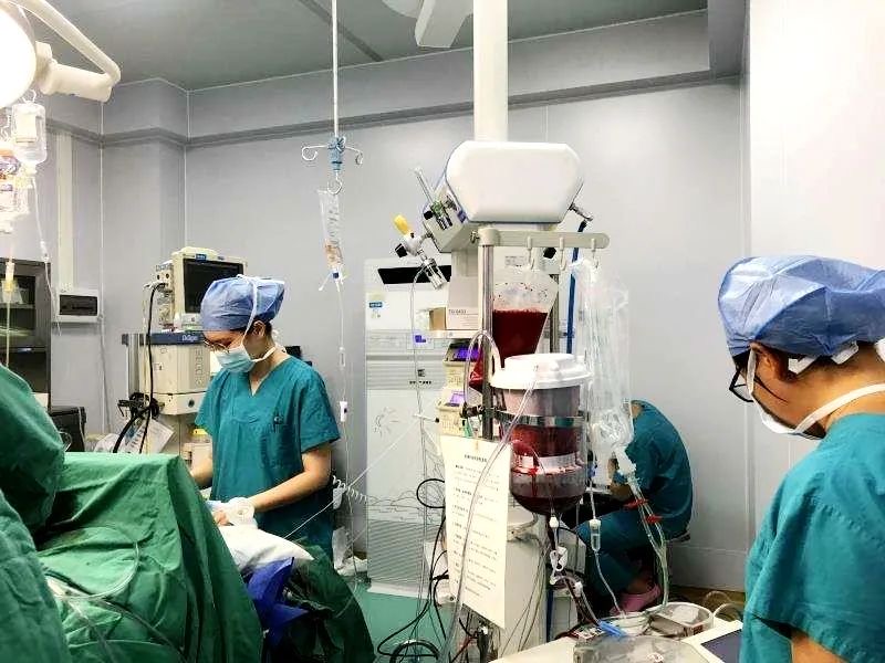 随即,手术团队行快速诱导麻醉,经口气管插管,连接麻醉呼吸机,控制呼吸;密切观察患者生命体征,处理循环的不稳定;B超引导下右侧颈内静脉穿刺置管,并呼叫拿血。与此同时,血液回收机也已安装完毕,检测无异常后便投入工作。