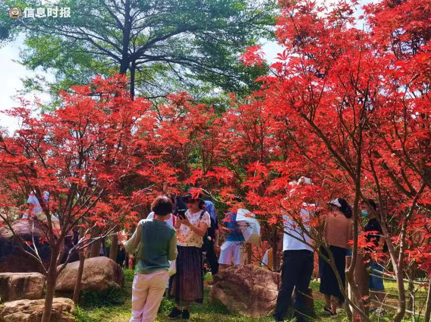 帽峰山海拔534.9米,是广州市内最高峰,其森林覆盖率达95%以上,素有广州“第二市肺”的美称。金秋十月,正是观赏满山红叶的好时节,在古庙景区天湖西侧的红枫园内,栽种了近千株鸡爪槭红枫树,枝条细长光滑,叶形优美,树高约2-4米,非常适合街坊们观赏拍摄。
