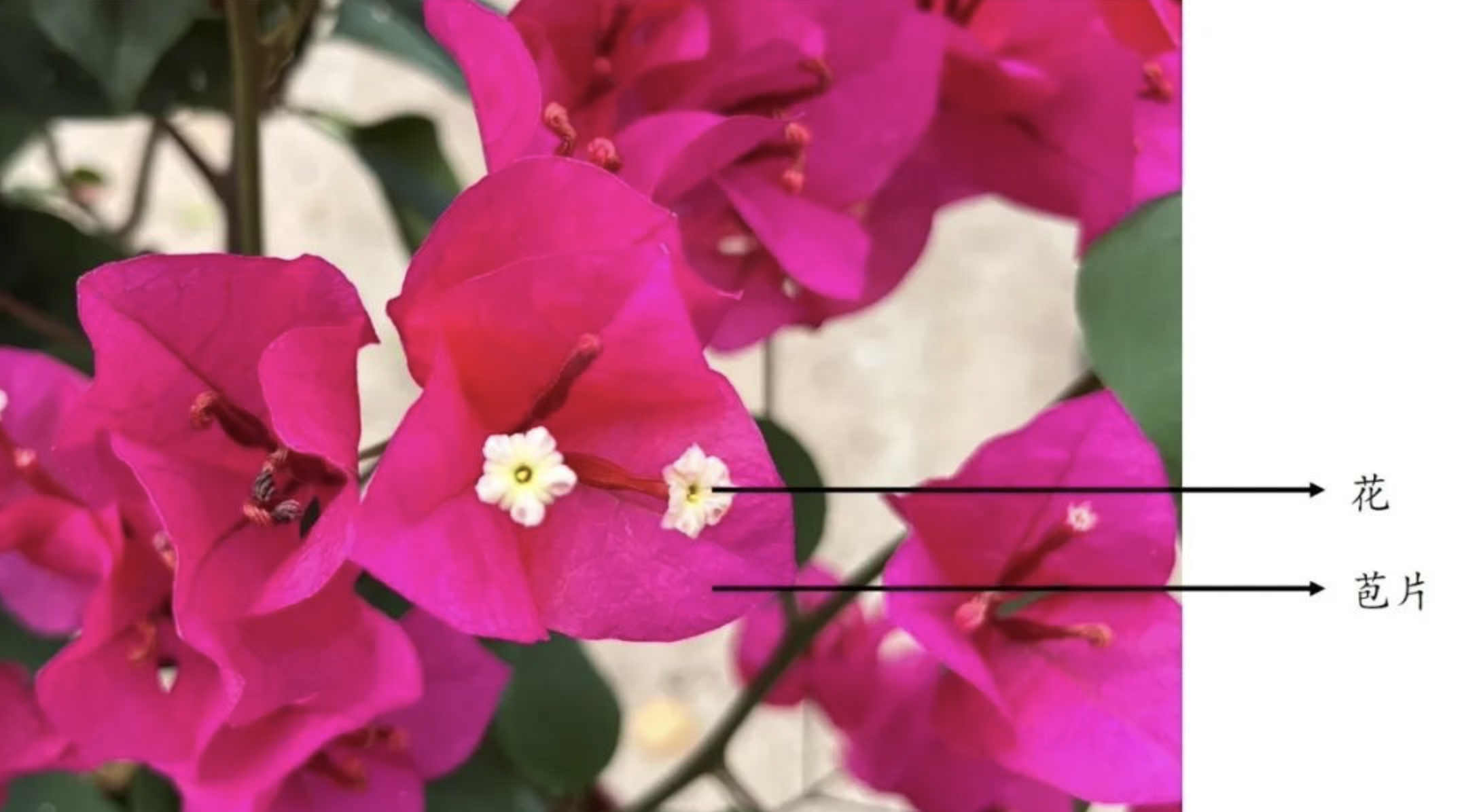 三角梅如此绚丽多彩的“花朵”真的是它的花吗?仔细观察会发现,三角梅最重要的观赏部位其实是它的苞片,上面还有清晰的叶脉,形状硕大,色彩绚丽,似花非花却胜花。三角梅为什么要用苞片来“冒充”花朵呢?