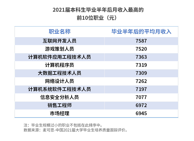 具体到职业来看,2021届本科毕业生月收入排名靠前的职业主要来自互联网、计算机、大数据等岗位,其中互联网开发人员月收入最高,达到7587元。