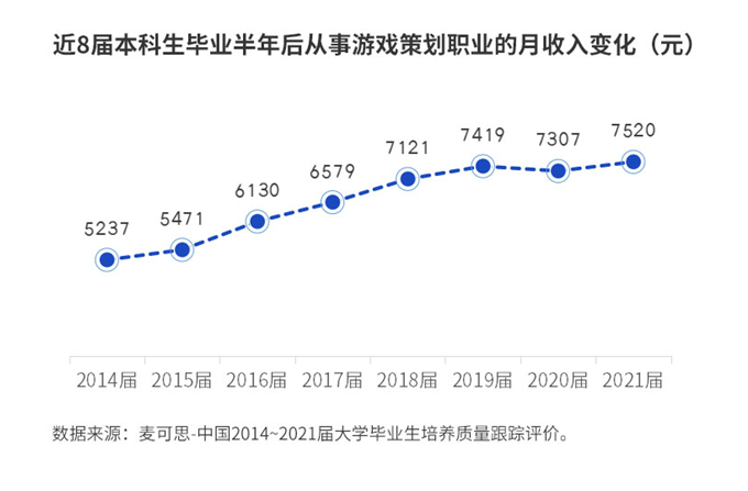 值得注意的是,数字经济时代,游戏产业发展快速,同时现代游戏不断与其它产业融合,直接带动就业市场对游戏人才的需求。通过盘点我们发现,游戏策划人员作为新增职业,一出现就冲进2014届本科生高薪职业TOP10榜单中,并且从事该职业的本科生月收入已连续8年均保持在高薪榜前三位,但近3年薪资增长有所放缓。