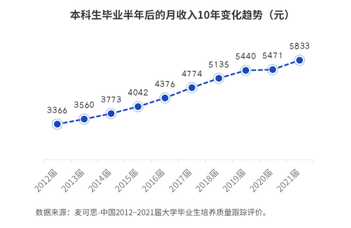 最近10年的《中国本科生就业报告》(就业蓝皮书)数据显示,应届本科生毕业半年后的月收入从2012届的3366元,增长至2021届的5833元,涨幅为73%。