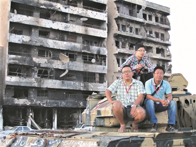 本报记者在利比亚的废墟前合影。