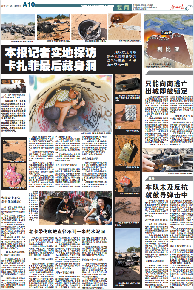 2011年11月4日,本报刊登了《本报记者实地探访卡扎菲最后藏身洞》等战地前线报道。