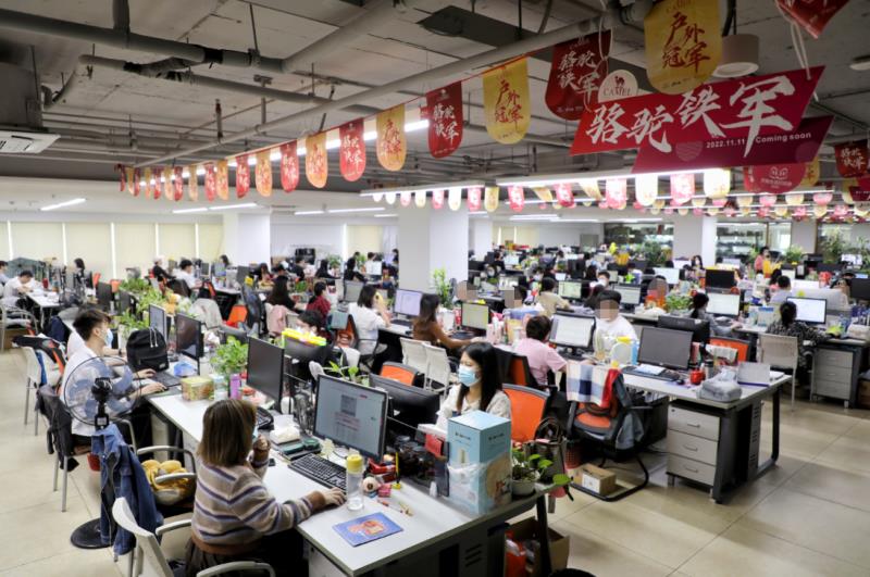 在位于三元里街的骆驼中恒大厦,备战"双十一"的口号标语随处可见。10月31日晚上8时,全网启动“双十一”大卖模式,骆驼品牌在前40分钟就完成去年全天的销售额,户外冲锋衣拿到行业第一,单品近2000万元,工装靴、户外鞋登上行业TOP榜单。
