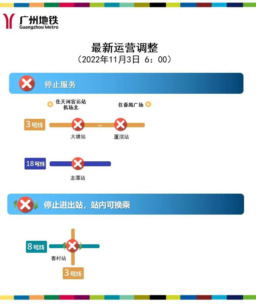 截至目前,三号线大塘站、厦滘站,三号线及八号线客村站,十八号线龙潭站停止对外服务,其中客村站保留站内换乘功能。