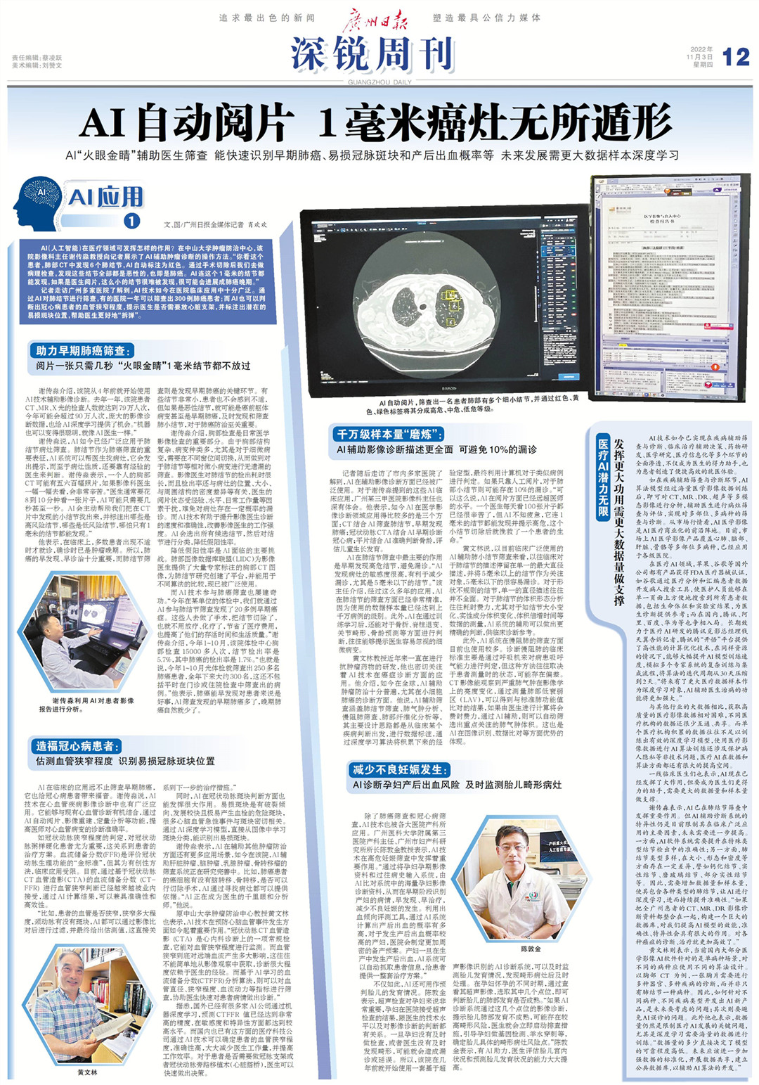 记者随后走访了市内多家医院了解到,AI在辅助影像诊断方面已经被广泛使用。对于谢传淼提到的这些AI临床应用,广州某三甲医院影像科主任也深有体会。他表示,如今AI在医学影像诊断领域应用得比较多的是三个方面:CT结合AI筛查肺结节,早期发现肺癌;冠状动脉CTA结合AI早期诊断冠心病;平片结合AI准确判断骨龄,评估儿童生长发育。
