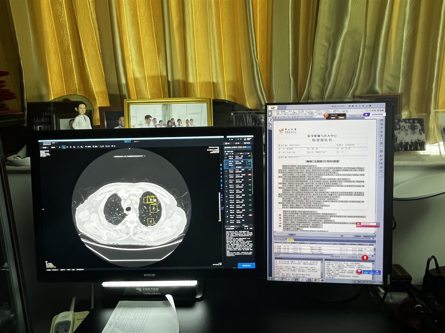AI(人工智能)在医疗领域可发挥怎样的作用?在中山大学肿瘤防治中心,该院影像科主任谢传淼教授向记者展示了AI辅助肿瘤诊断的操作方法。“你看这个患者,肺部CT中发现6个肺结节,AI自动标注为红色。通过手术切除后我们去做病理检查,发现这些结节全部都是恶性的,也即是肺癌。AI连这个1毫米的结节都能发现,如果是医生阅片,这么小的结节很难被发现,很可能会进展成肺癌晚期。”