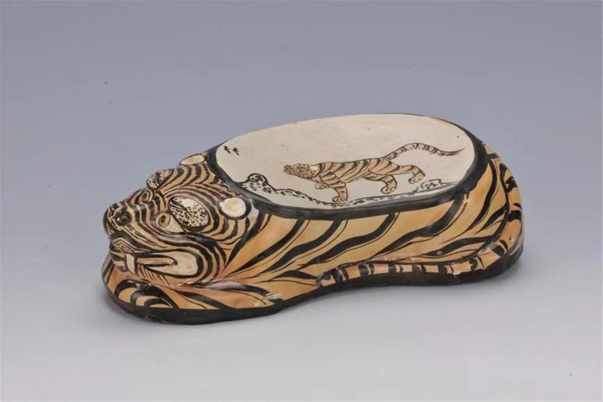 本次与“元宝”一同亮相的是南越王博物院馆藏珍品——金代褐黑彩飞雁行虎纹虎形枕。这件文物是褐灰白色砂质半陶瓷胎,透明釉,有开片。虎鼻孔为两个透气孔。侧面褐地,饰黑褐彩虎皮纹,整体造型为一只传神的卧虎;枕面白地,饰黑彩飞雁行虎纹,一只老虎作行走状。造型拙稚随意,画风粗犷质朴,整体给人以“粗放之气”的艺术风格和时代特点。在金代,虎枕是北方极为流行的生活寝具,“虎”在中国传统文化中有驱邪、祈福的含义,寄托了人们的美好祈愿。