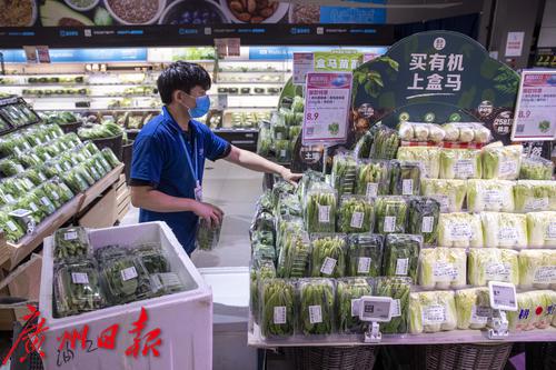 2022年11月5日下午1时30分左右,记者来到位于海珠区富基广场的盒马店,店内员工正在忙碌补货。不到半小时,三个货架已补充完成。