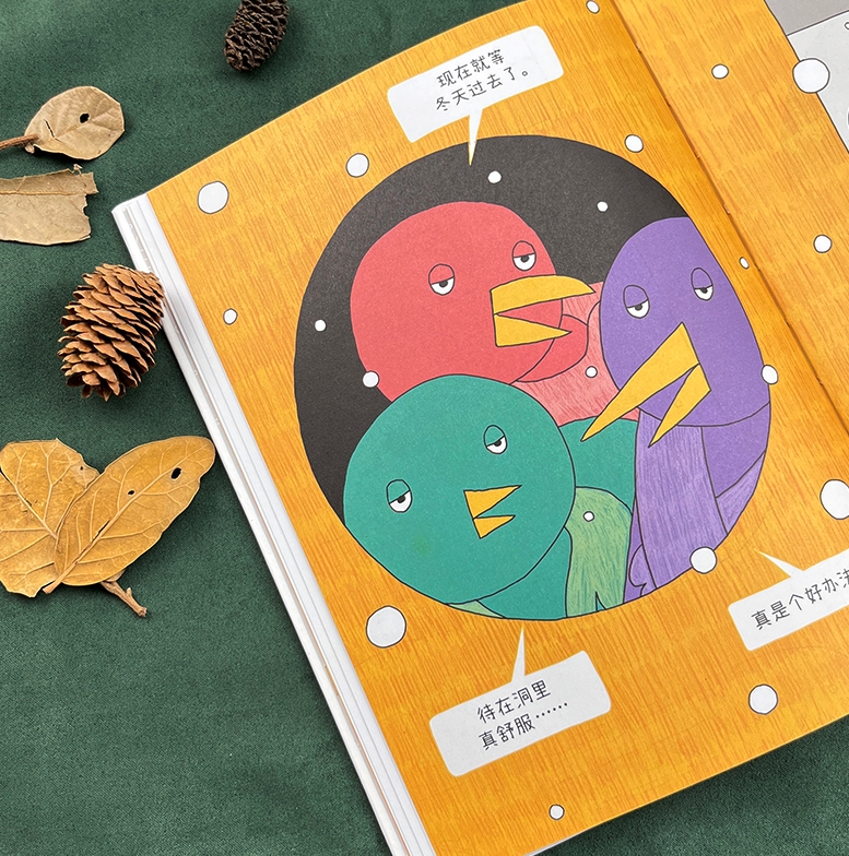 冬天快到了,北方的鸟儿不迁徙,就待在原地过冬可以吗?这本书的三只鸟儿以它们的行动告诉我们:这行不通!这三只鸟儿因为犯懒没有迁徙,结果寒风和大雪让它们叫苦不迭。它们穿衣服、潜水、冬眠,想尽了各种办法抵抗寒冷和饥饿,每次灵机一动的尝试都收获了意想不到的结果,制造了无穷的欢乐。而最后,它们只有迁徙一个办法,但在终点,又有惊喜等着它们……