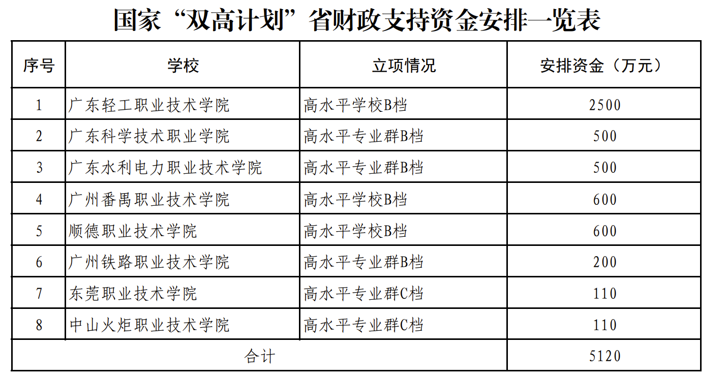 国家“双高计划”省财政支持资金共安排5120万元,由8所院校获得。其中,广东轻工职业技术学院拟获得2500万元,广州番禺职业技术学院、顺德职业技术学院各获600万元,广东科学技术职业学院、广东水利电力职业技术学院各获500万元,广州铁路职业技术学院获200万元,东莞职业技术学院、中山火炬职业技术学院各110万元。