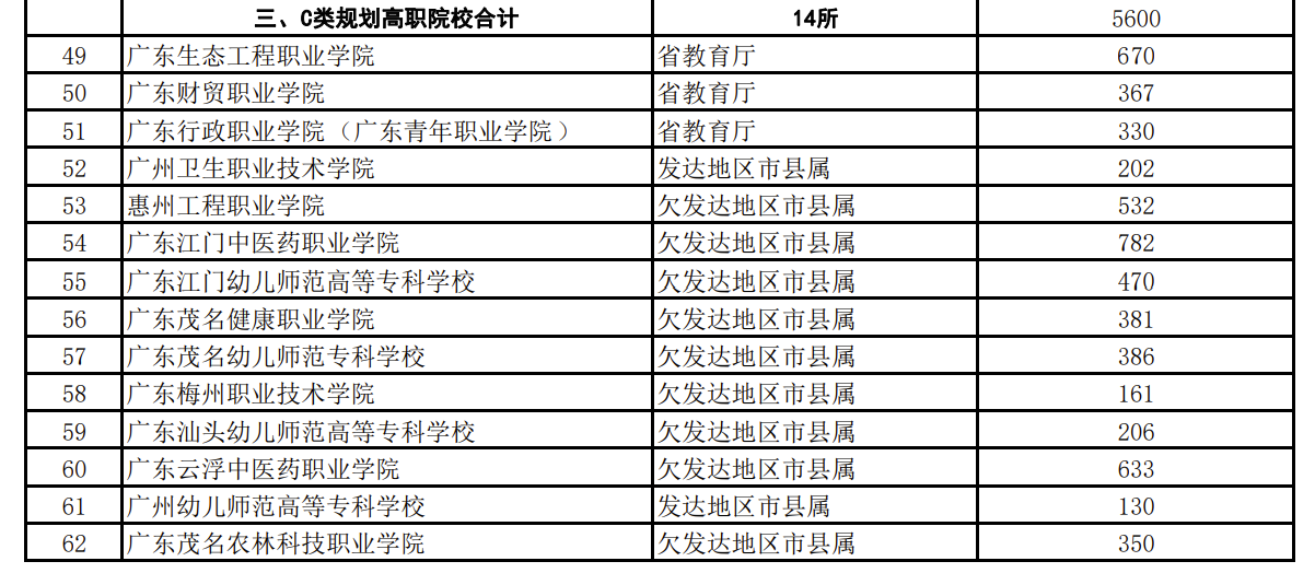 C类规划高职院校合计14所,共获资金5600万元,广东江门中医药职业学院、广东生态工程职业学院、广东云浮中医药职业学院占据前三名,分别拟获得资金782万元、670万元、633万元。