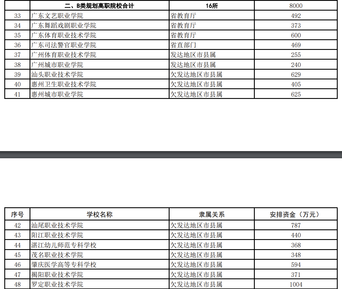B类规划高职院校合计16所,共获资金8000万元,罗定职业技术学院、汕尾职业技术学院、汕头职业技术学院居前三位,分别拟获得资金1004万元、787万元、629万元。